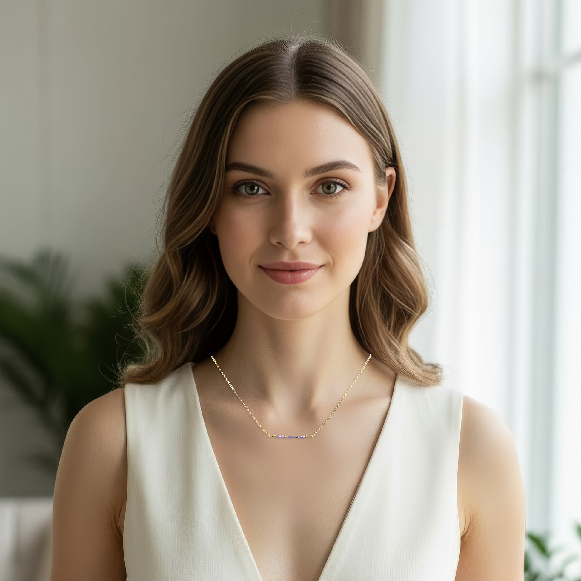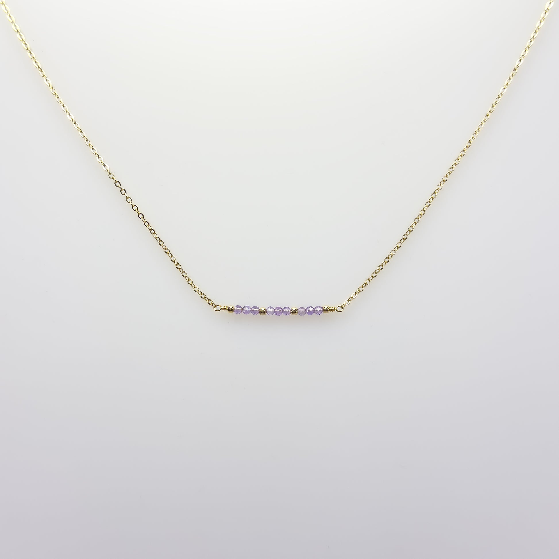 A delicate row of soft lavender amethyst creates a subtle wash of color across the neckline. The minimalist bar design highlights the natural beauty of each faceted gemstone, offering a refined accent that feels both effortless and feminine.