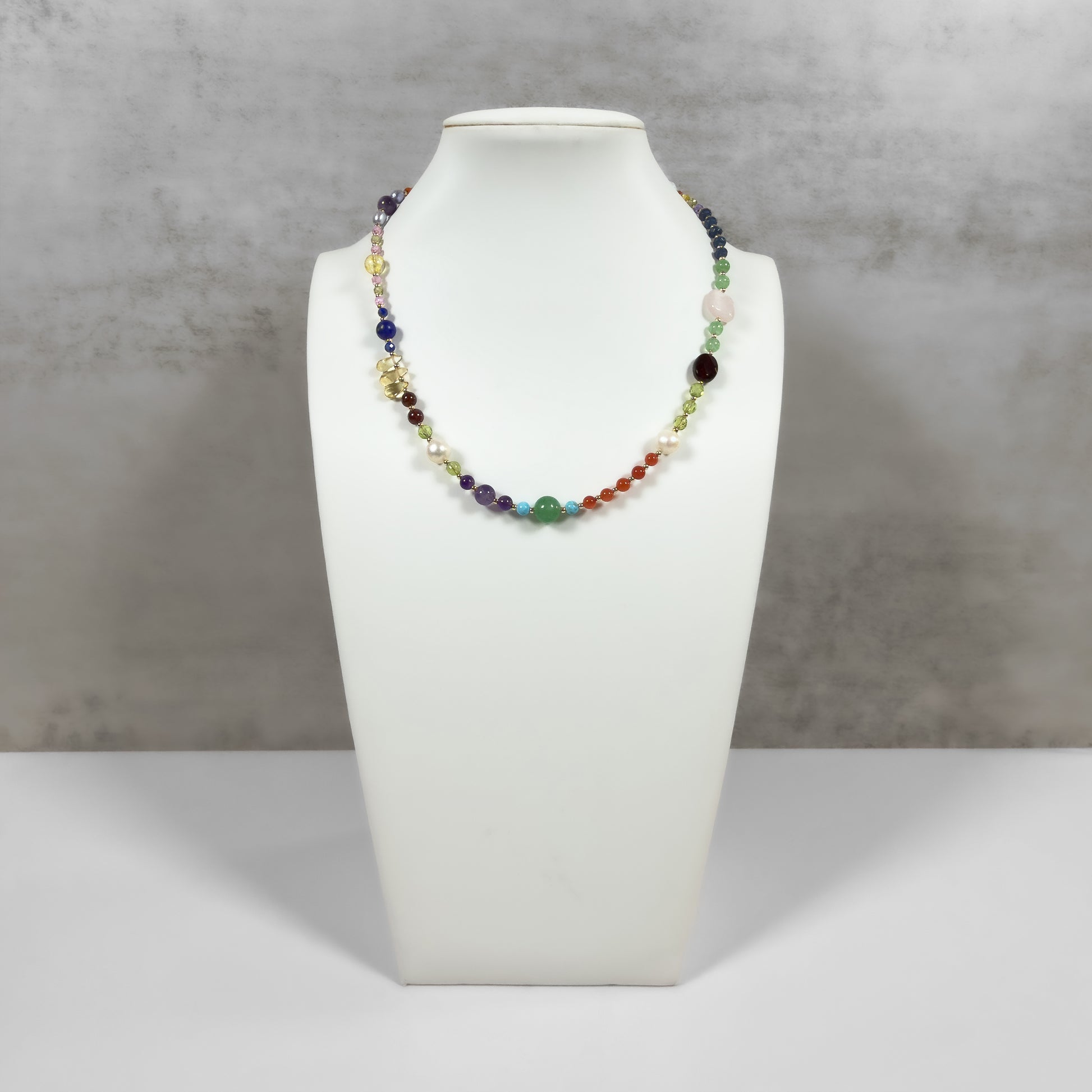 Featuring vibrant, carefully selected gemstone beads in a harmonious blend of colors, this piece brings refined sophistication to any ensemble. Crafted in your choice of 14 karat gold filled or sterling silver, it offers both durability and timeless appeal. The adjustable length of (approximately starting at) 16 to 18 inches ensures a perfect fit for any neckline, making it a versatile addition to your jewelry collection.