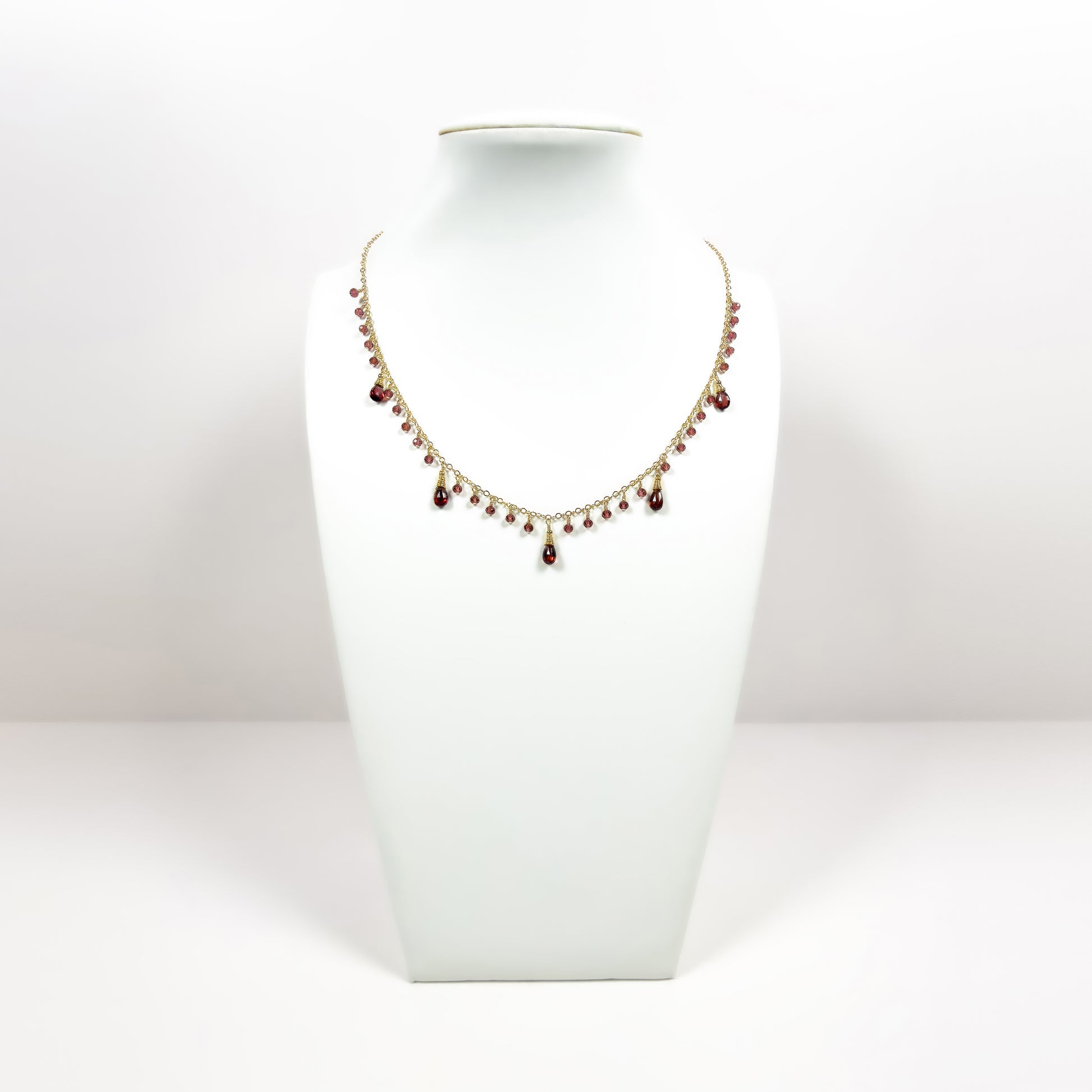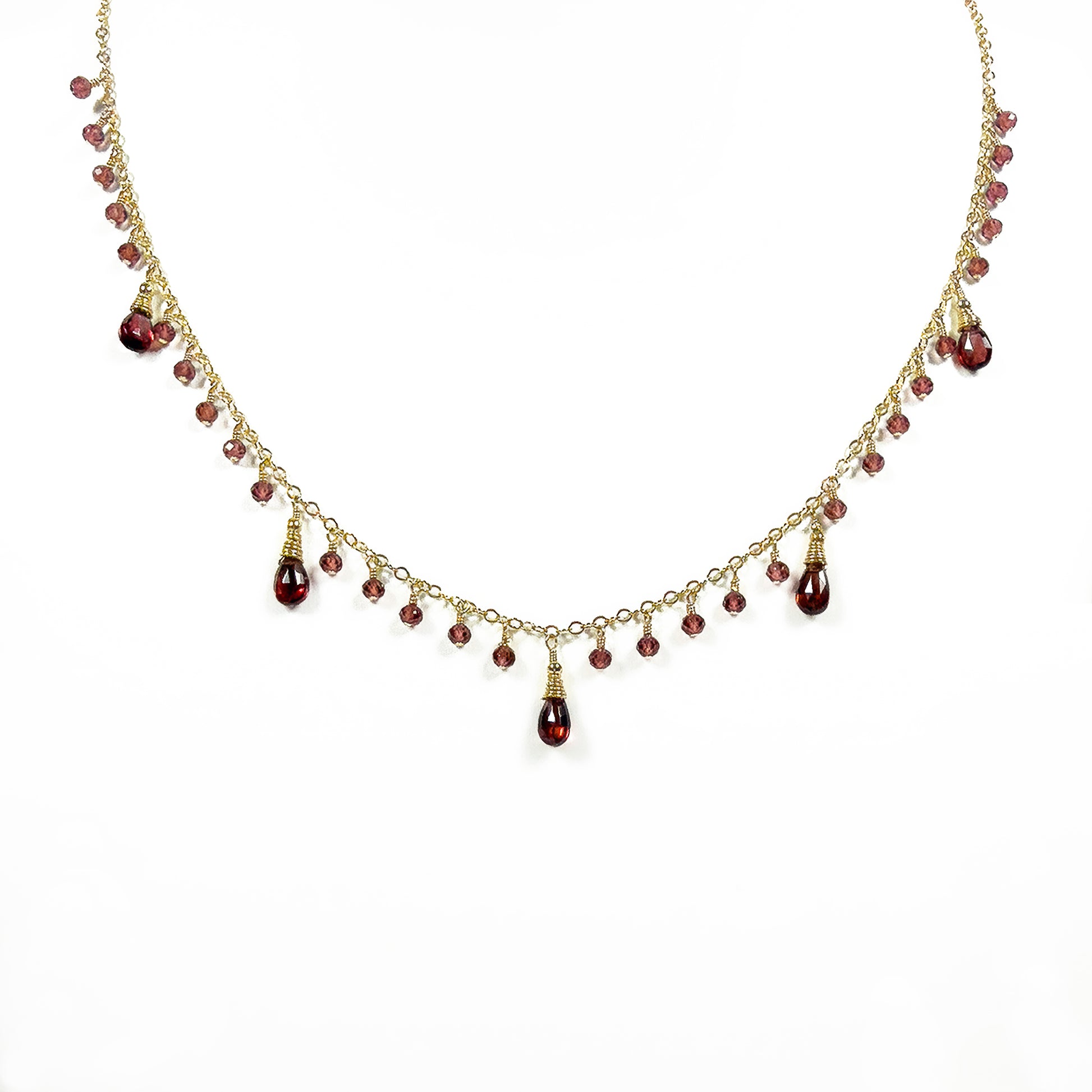 This garnet charms necklace exemplifies refined boho aesthetics through its thoughtful design. The necklace showcases red garnets, prized for their rich color and symbolic significance. The suspended charm configuration allows for graceful movement, while the 14 karat gold filled setting ensures durability and lasting luster. An investment piece that transcends seasonal trends.